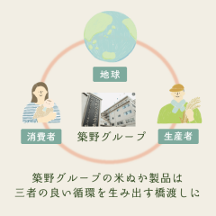 当社は長年、こめ油の原料である米ぬかの成分に着目し、研究を進めてまいりました。精米時に発生する副産物である米ぬかの成分を抽出することで、こめ油だけでなく食品、化学、医療、化粧品等の幅広い分野への高度有効利用をし、米ぬかの100%活用をしています。今後も国内の米ぬかを活用することで地球・生産者・消費者の良い循環の実現を目指していきたいと考えています。
