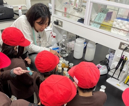 ・化粧品グループによるレクリエーション:化粧水作成や乳化の実演など、体験型プログラムを通じて科学の面白さを体感。