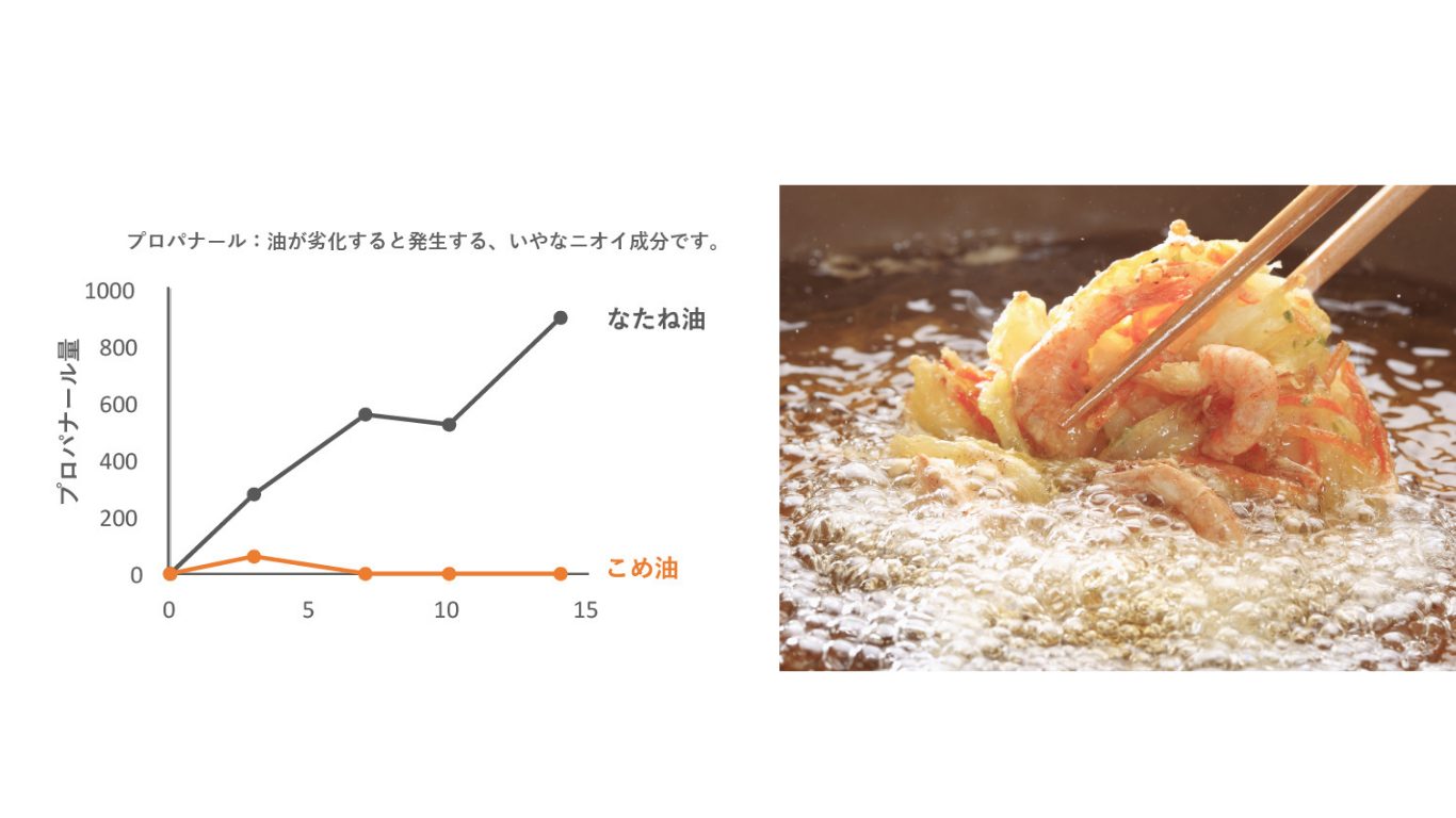 こめ油は、油酔いの原因となるアクロレインや、青臭いニオイの原因物質の発生が少ないのが特長です。揚げ物調理時の不快なニオイがこもりにくく、髪や服にもニオイがつきにくいため、調理に携わる方にも快適です。