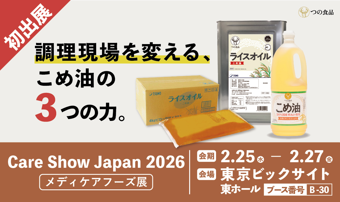 「お米の油は、つの食品。」の築野食品工業株式会社(本社:和歌山県伊都郡 代表取締役社長 築野富美 https://www.tsuno.co.jp/)は、2026年2月25日(水)~27日(金)に東京ビックサイト 東ホールで開催される「Care Show Japan 2026(メディケアフーズ展)」に出展いたします。本展示では、安定した品質と作業効率が求められる現場の「調理場内の油ニオイ」「揚げ油の早期劣化」「素材の味が活きない」という三大課題の解決を提案する、業務用こめ油「ライスオイル」を中心に、各種こめ油製品を紹介いたします。