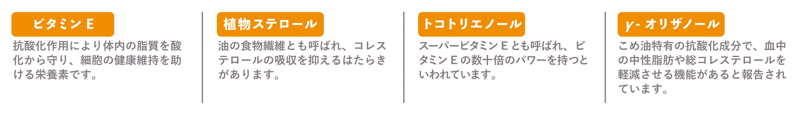 こめ油は、米ぬか由来の天然の機能性成分を豊富に含んでいます。これらの成分が、酸化に強く、健康的な食生活を支える特長につながっています。