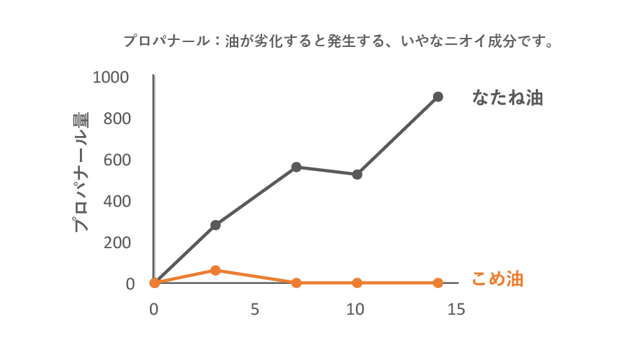 人は唾液に溶ける成分を「味」として感じます。こめ油は、くせのある風味の原因となる成分の発生が少なく、素材本来の味を引き立てるのが特長です。また、油酔い物質や青臭いにおいの発生も一般的なサラダ油に比べて少ないため、揚げ物調理時もニオイがこもりにくく、快適にお使いいただけます。髪や衣服にもニオイがつきにくい油です。