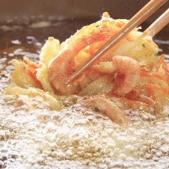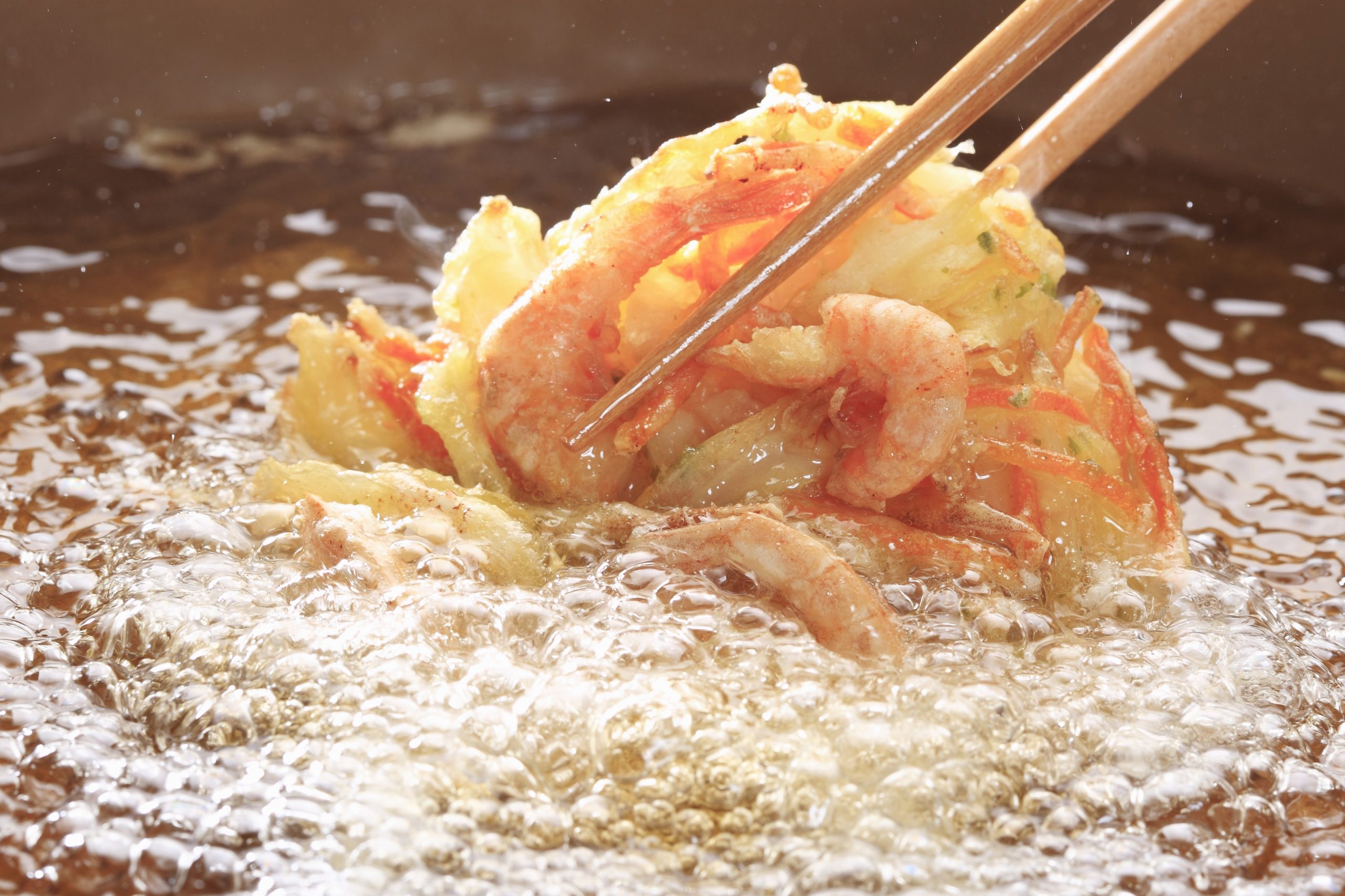 人は唾液に溶ける成分を「味」として感じます。こめ油は、くせのある風味の原因となる成分の発生が少なく、素材本来の味を引き立てるのが特長です。また、油酔い物質や青臭いにおいの発生も一般的なサラダ油に比べて少ないため、揚げ物調理時もニオイがこもりにくく、快適にお使いいただけます。髪や衣服にもニオイがつきにくい油です。
